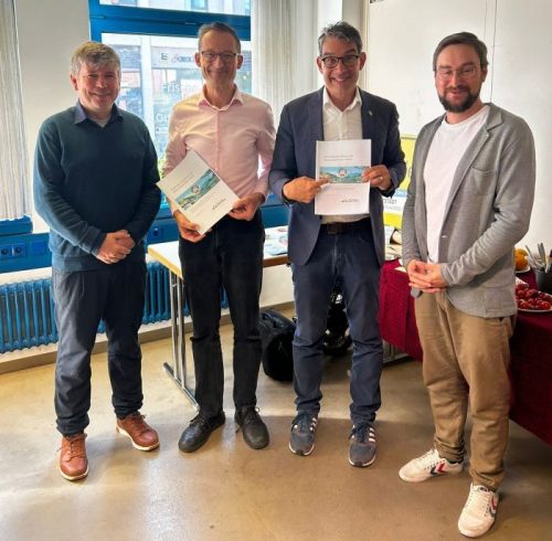 Rhein-Neckar-Fair präsentierte zu diesem Anlass sein Beratungsangebot zur nachhaltigen Beschaffung mit seiner Hilfestellung zur nachhaltigen Beschaffung inklusive der rechtlich geprüften Muster-Dienstanweisung für Kommunen, die in allen drei Bundesländern der Metropolregion anwendbar ist. Im Anschluss überreichten Michael Remiorz (VRRN) und Dr. Stefan Dietrich (Eine-Welt-Zentrum Heidelberg e.V.) ein Exemplar der Hilfestellung an Dr. André Bauman sowie an MdL Hermino Katzenstein (siehe Fot0).
